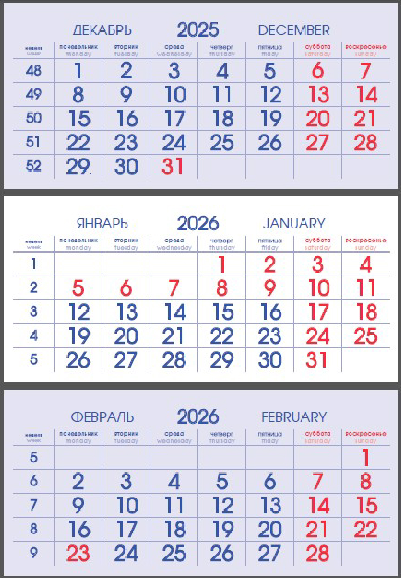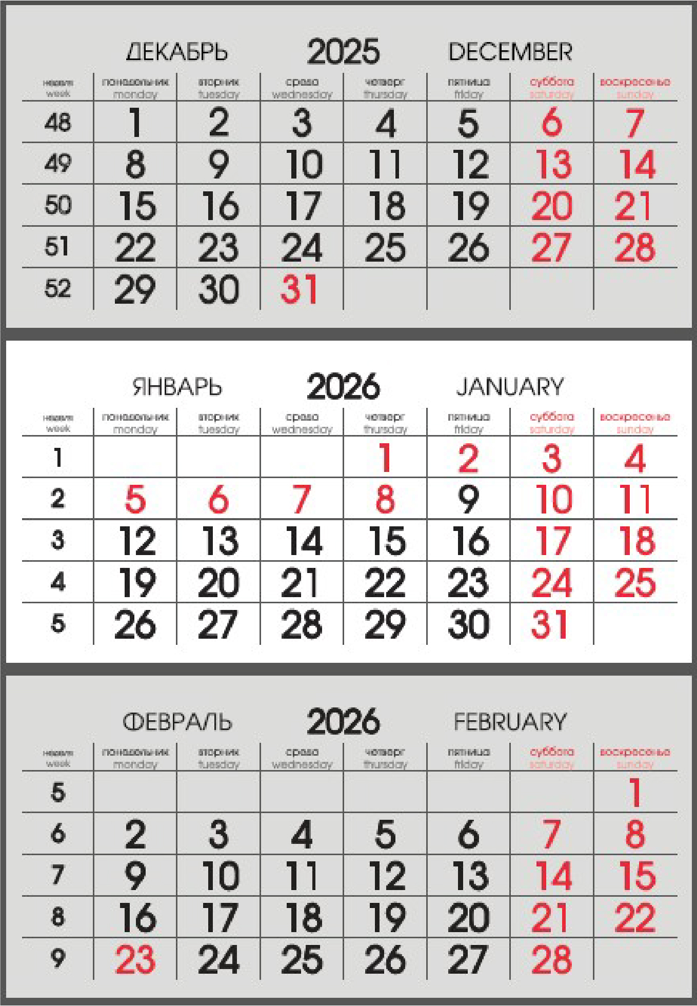 Серые численники также представлены в формате 3 блока: серый - белый - серый. Элегантный серый цвет придаёт календарю стильный и современный вид, отлично вписываясь в любые интерьеры.Праздничные и выходные дни выделены красным.